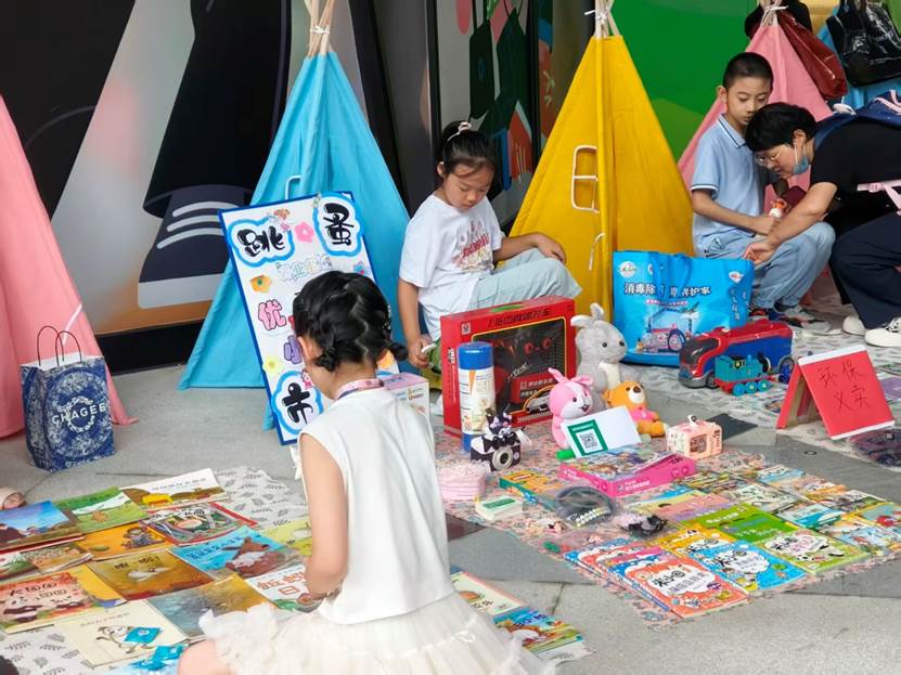 “旧物变卖区”里,孩子们的摊位堪称“迷你宝藏铺”:奥特曼卡片、毛绒玩偶、科普绘本整齐排列,不少摊位前还立着“国庆特惠,买一送小国旗”的手绘海报。孩子们从起初的腼腆,逐渐放开嗓门吆喝,遇到顾客还会主动介绍“这个玩具我保护得很好,现在传给你继续玩”,在交易中学会分享与珍惜。“国庆卖旧玩具,既能锻炼自己,又能让东西不浪费,特别有意义!”刚卖出一套积木的小朋友,举着零钱兴奋地说。